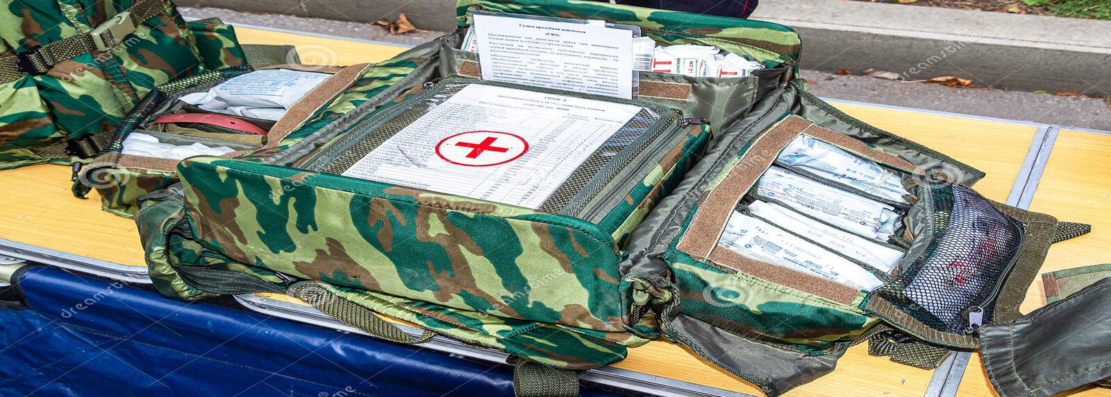 1 EFA First Aid Book, 20 Pill Bottles, 100 Bandage Strips, 1″x3″, 14 Pain Relievers, 10 Bandage Strips, 2″x4″, 4 Triple Antibiotic Packages, 10 Knuckle Bandages, 4 First Aid Cream Packages, 10 Butterfly Strips, 2 Burn Aid Packages, 4 Bandage Gauzes, 2″x6 Yards, 1 SAM/Universal Splint, 4 Elastic Bandages, 6″, 1 EMT Shears, 7.25″, 2 Triangular Bandage, 1 Pair of Tweezers, 3 Field Dressings, 1 Stethoscope, 4 Multi Trauma Dressings 12″x30″, 1 Tourniquet, 1 Blood Stopper Kit, 1 Scalpel handle #3, 4 Sterile Pads, 4″x4″, 2 Scalpel Baldes